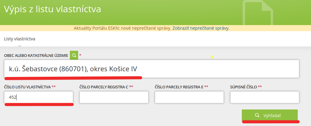 - Do kolónky "ČÍSLO LISTU VLASTNÍCTVA" zadajte číslo Vášho LV, napríklad: 452 a kliknite Vyhľadať