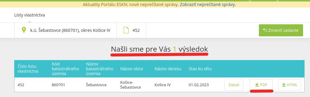 - Pre kontrolu údajov stiahnite LV v PDF formáte a po otvorení LV si skontrolujte údaje k Vášmu podielu/vlastníctvu
